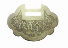 锁片是民间饰物中的一种,它以银铜质居多,锁片在旧时多由长辈送给幼儿佩戴,相传佩戴锁片可消灾避难,从而“锁”住孩童性命。