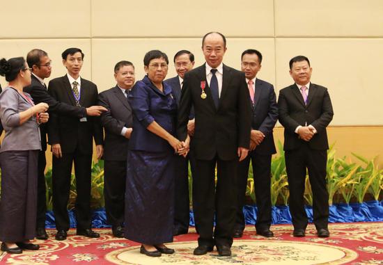 柬埔寨文化艺术大臣彭萨格娜为中国文化遗产研究院顾军颁发柬埔寨王国骑士勋章 国家文物局供图