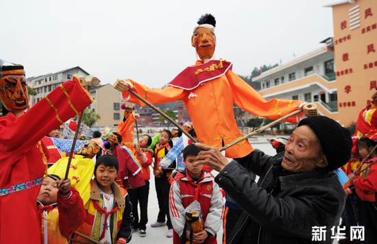 12月19日,在贵州省石阡县花桥镇小学,传承人傅正贵在指导学生练习石阡木偶戏。 近年来,为传承和保护石阡木偶戏,贵州省石阡县将木偶戏引入校园,定期邀请传承人到学校为师生指导授课。学校还通过兴趣活动课、课间集体展示等方式,让石阡木偶戏这一古老民间艺术形式在校园中得以展示和传承。 石阡木偶戏是流传于贵州省石阡县的一种传统傀儡戏曲剧种,2006年被列入第一批国家级非物质文化遗产名录。