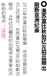 今秋苏富比拍卖行拍出了总价为42亿港币的藏品。该拍卖行称,在其举办的一系列香港拍卖活动中,这一金额创下了历史最高纪录。[详细]