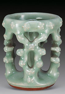 一件瓷器开什么样的片,大片还是小片,用何种方式开片都是有讲究的。人为是可以控制的,体现出龙泉窑工的精湛技艺,如根据胎釉的配方不同、收缩力不同,出现的效果也不同,开片控制技术是龙泉人特有的技艺。[详细]