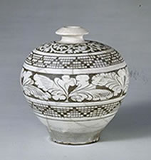 在当阳峪所收集的瓷片和器物之中,铁绘的装饰技法很多。它的工艺技法是在坯体上过白化状土后,在泥坯干燥之前用黑色绘料(一种含三氧化铁的矿物质绘料)快速将纹样绘成。所以,画工必须具备熟练的技巧,以较快的速度一气呵成。