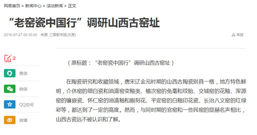 2016年7月11日至7月21日,为了挖掘山西古陶瓷之美,中国文物网和老窑瓷博物馆与大栅栏琉璃厂非遗服务中心联合承担国家发改委中国经济改革研究基金会部级课题,对山西省古窑址进行了为期11天的调研工作。从2016年7月11日调研工作正式启动以来,调研组先后走访了山西境内6处古窑址——八义窑、平定窑、怀仁窑、榆次窑、介休窑、交城窑。行走足迹贯穿山西省全境。调研过程中,调研组走访了6处窑口制瓷工艺的复烧传承人、工艺美术师、民间收藏家和古陶瓷文化研究者等。[全文]