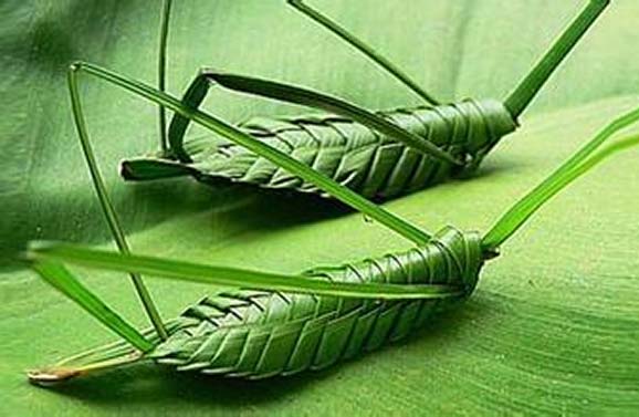 剪下一部份刚分离的叶片,将剪好的叶片插入身体的两侧,这样就完成了蚱蜢翅膀的部分。剪掉剩馀的叶梗,折成三等份插入身体中,这样就完成了蚱蜢的腿。如此一来,一只用树叶制作而成的草编蚱蜢就完成了!