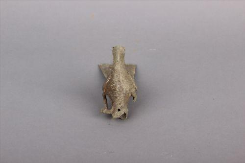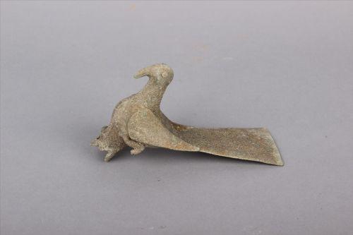 鸠杖,又称鸠杖首。所谓“鸠杖”,就是在手杖的扶手处做成斑鸠鸟的形状。忠州博物馆馆藏的这件汉铜鸠杖首,2000年出土于忠县宣公墓,长14.3厘米,宽4.5厘米,高9.6厘米。鸠杖长弯嘴、凸眼、长尾。鸠爪蜷曲,置于筒外两侧,似抓握状。头以下通体刻饰羽毛,笔法细腻,栩栩如生。