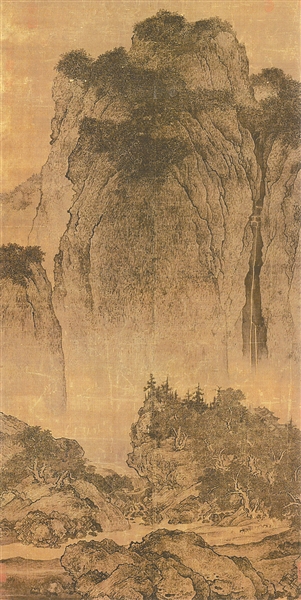 范宽《溪山行旅图》,绢本,浅设色,纵206.3厘米,横103.3厘米,台北“故宫博物院”藏。此图是唯一为学术界公认的范宽真迹,也是存世国宝级中国画之一。图中巍峨雄壮的山峦如恒如泰,真的是“落笔雄伟老硬,真得山骨”。山顶依然是范宽从荆浩那学来的在突兀的岩石上画出繁茂的林木;山下则是以近景角度写出山石、茂林和溪水,贯穿其中的山路上正有一队满载货物的商旅。此外,作品中还有许多细节可以品赏,如山间庙宇和山路僧人,使作品的可赏、可玩、可游。所表现出的足以代表北宋山水画的“无我之境”更慑人心魄,而《图画见闻志》所称“峰峦浑厚,势状雄强,枪笔俱均,人屋皆质”等特点都可以在此得以印证,难怪有人说“范宽以后无此品”。