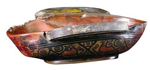 皇帝需要将领的绝对忠心,达到这一目的的方法之一便是赠送他们能体现皇帝威仪的物品。这只漆杯,很可能是公元4年左右,汉朝皇帝赠送给他在朝鲜的一位将军的礼品。漆杯为木制,椭圆形,直径约17厘米,大部分碗体由红棕色的漆层覆盖。