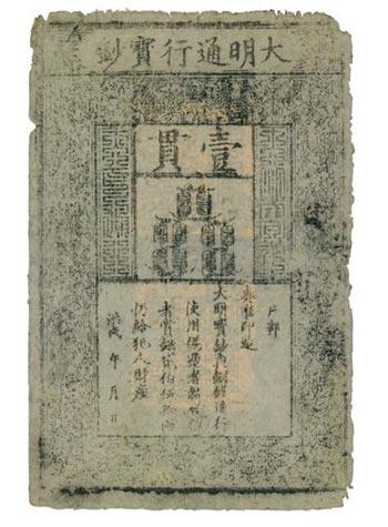 在世界上大多数地方还在使用金币、银币和铜币时,某个中国人发明了纸币,成为人类历史上一项革命性的发明。图中纸币,中国人称之为“飞钱”,用桑穰制作,比A4纸略大,最顶端印有六个大字:大明通行宝钞。
