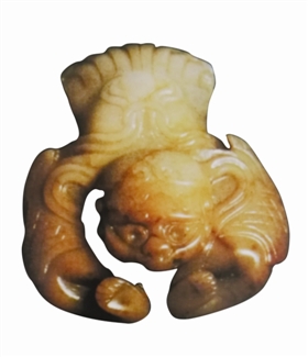 这件高5.7厘米、亚洲艺术馆馆藏的唐代玉头饰,所塑动物形象即来自域外的瑞兽。此兽为黄褐色,笔者推断其形象应为域外的母狮,作蹲伏状。其神情闲适,形象威武但不失顽皮。大耳,环眼,扁鼻,闭嘴,四肢伏于地,全身带螺旋纹。尤其是前伸的两腿,十分拟人化,匠心别具。而左侧似有一鱼,似将被瑞兽饱餐。其尾部较长,并呈装饰性排列,作头饰的功能明显。此唐代玉头饰与前朝玉器的造型、用途相比较,既可作头饰,又可陈设和把玩,实乃一器多用而明显不同。