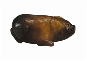这是亚洲艺术馆馆藏的一件唐代玉豕。它高4.4、宽9.2厘米,以黑褐色的整块玉圆雕而成。短耳,圆眼,嘴巴紧闭,尾巴贴于臀部,体态肥硕,四肢短小,作俯卧状。其造型布局均匀,线条简洁流畅,琢磨极好。且玉豕面部表情温和,神态生动逼真,憨态可掬。特别是以阴线雕刻手法,雕琢出头、四肢、尾的玉豕轮廓,手法凌厉,具有较强的概括性。同时仅用浅浮雕的简单几条线,便刻画了玉豕四肢,沉稳肥实,力道十足。而敦实饱满的玉豕体型,又令唐代玉器的时代特征非常明显,不失为一件精致的玉雕艺术品。